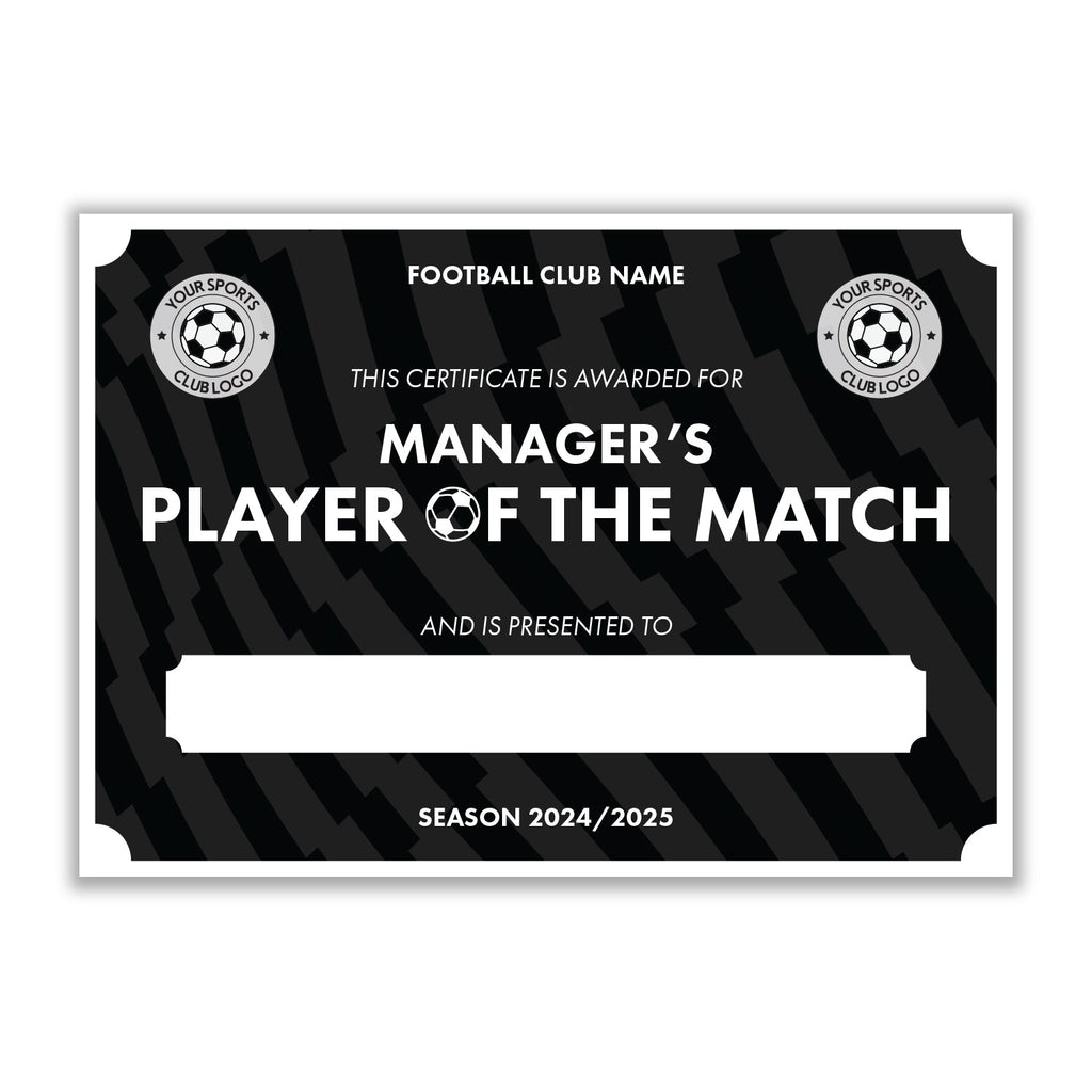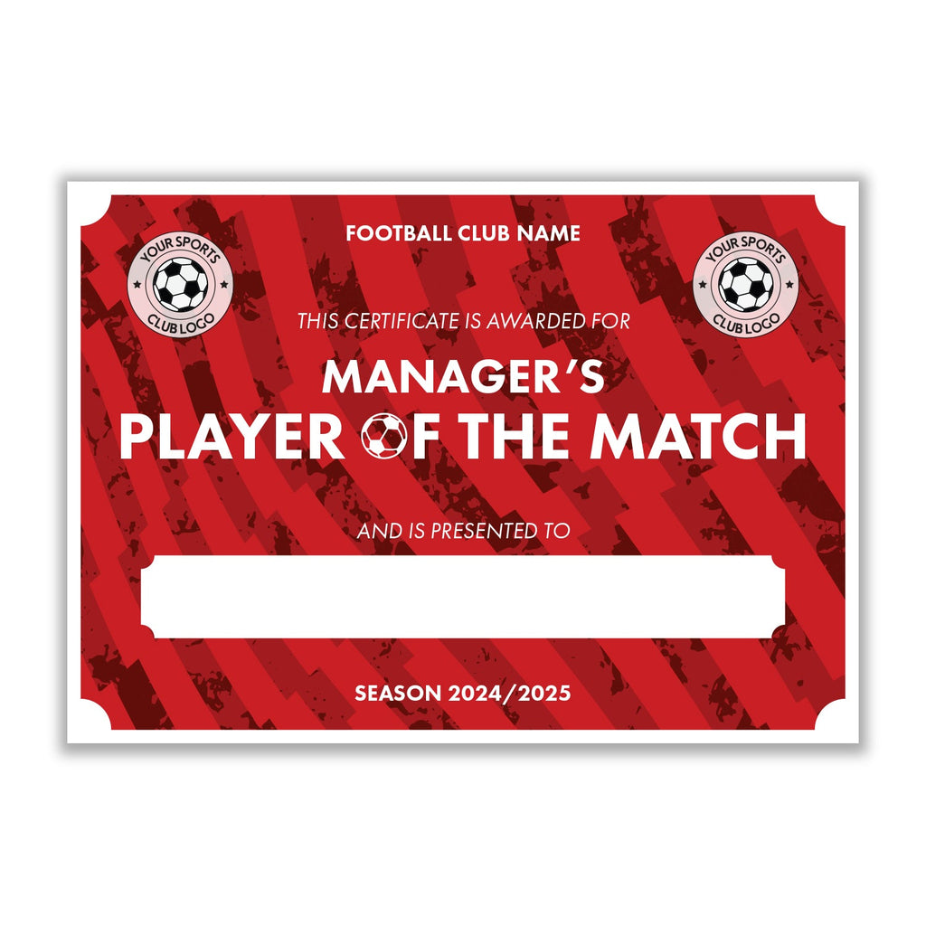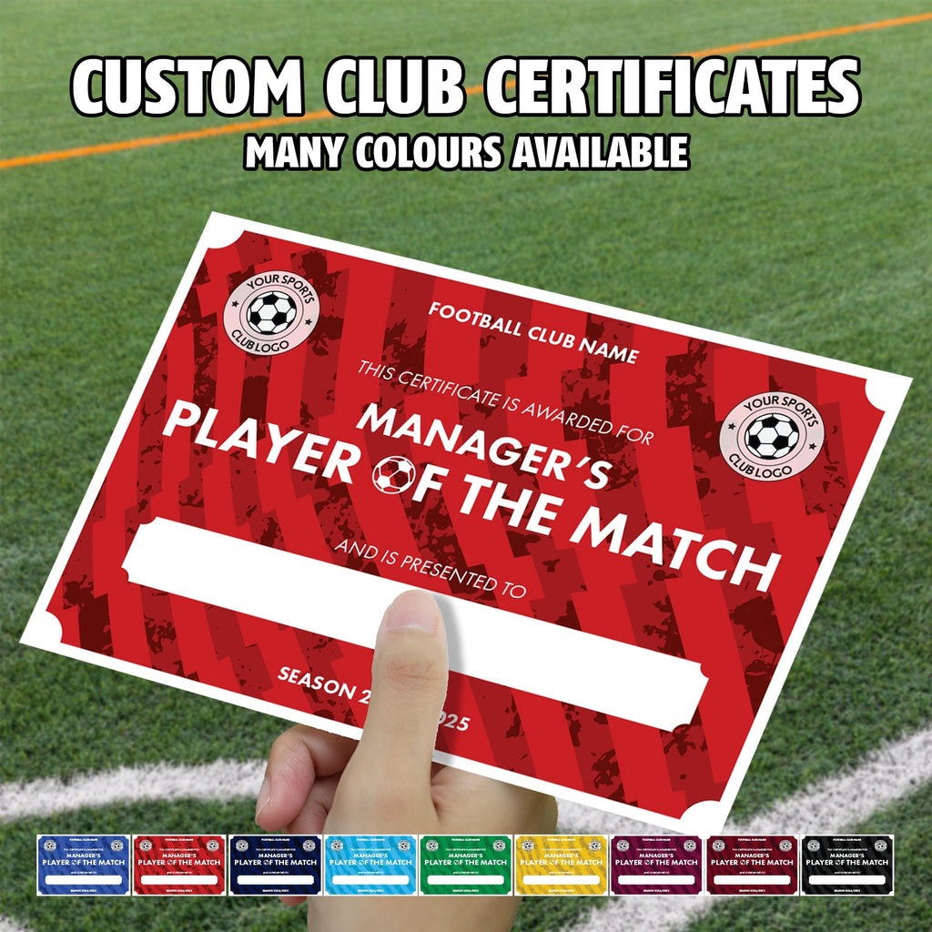 Personalised Football Club Certificates - Manager's Player Of The Match Custom Design (9 Colours)