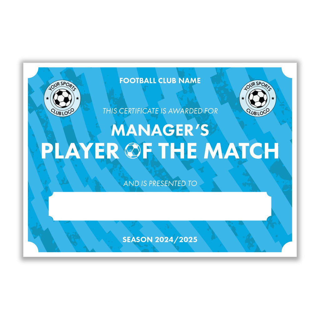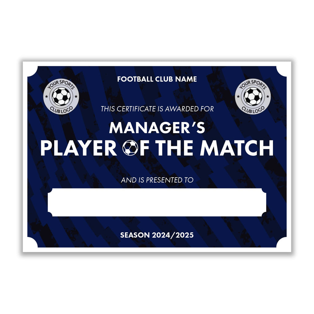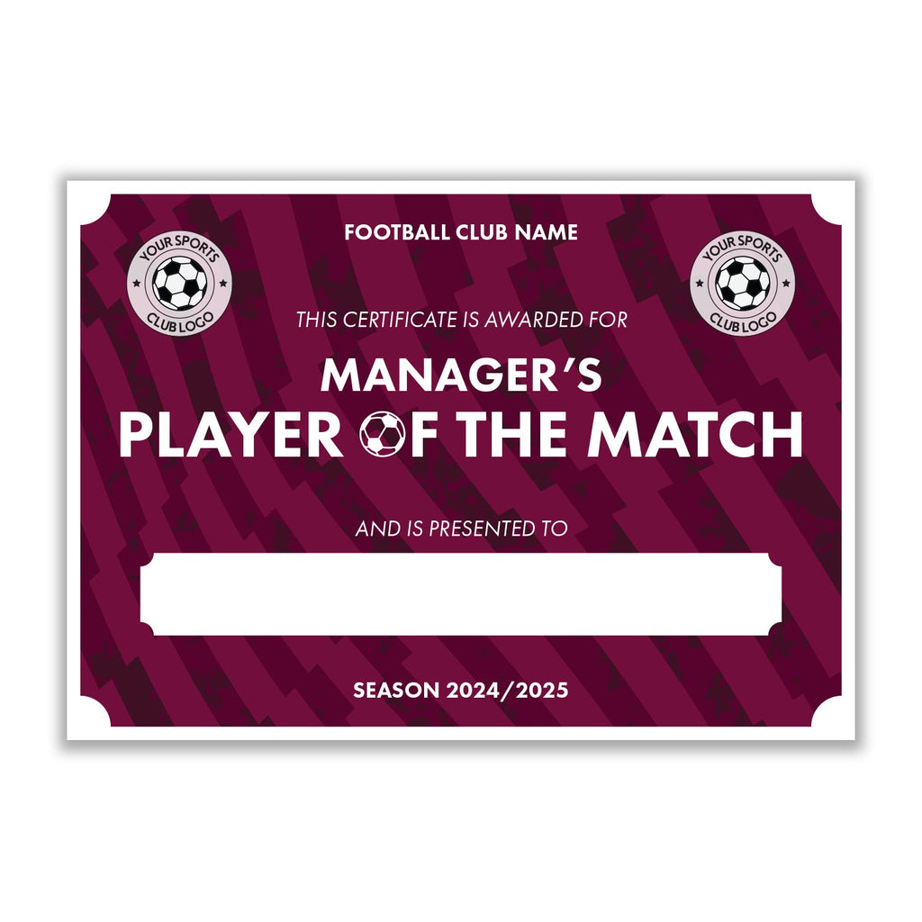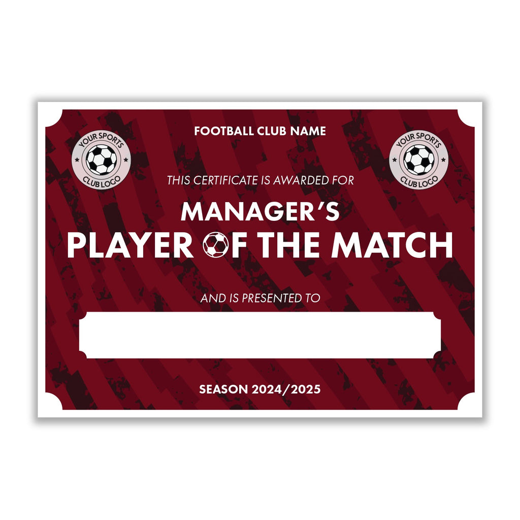 Personalised Football Club Certificates - Manager's Player Of The Match Custom Design (9 Colours)