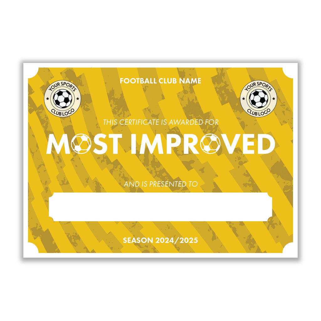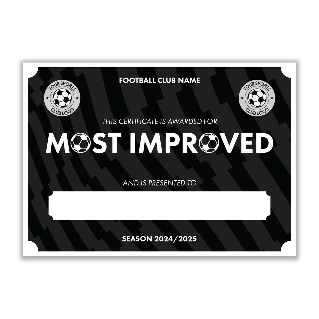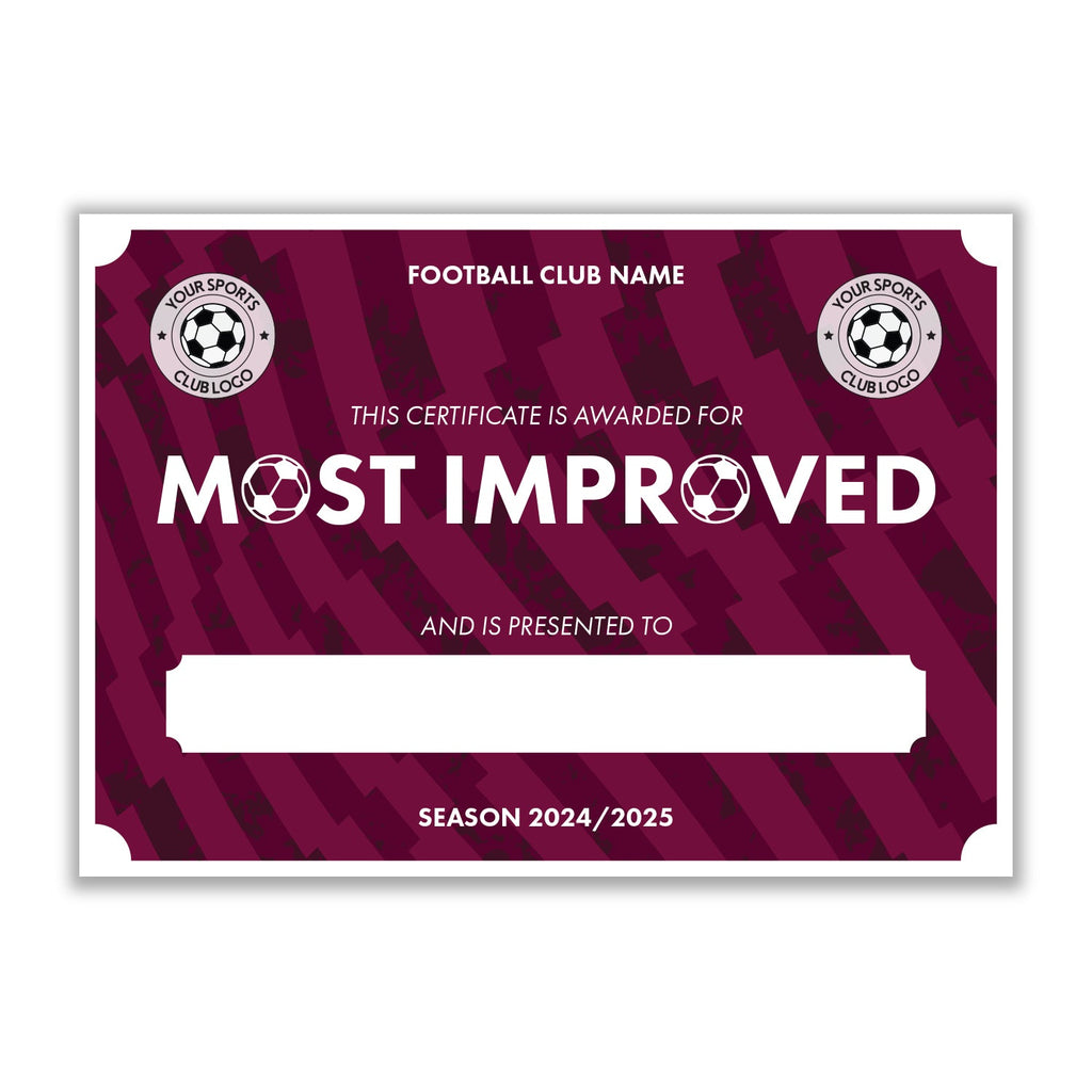 Personalised Football Club Certificates - Most Improved Player Custom Design (9 Colours)