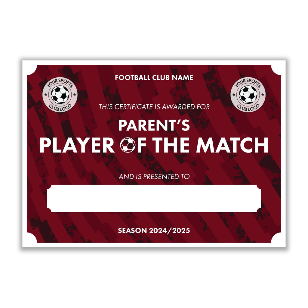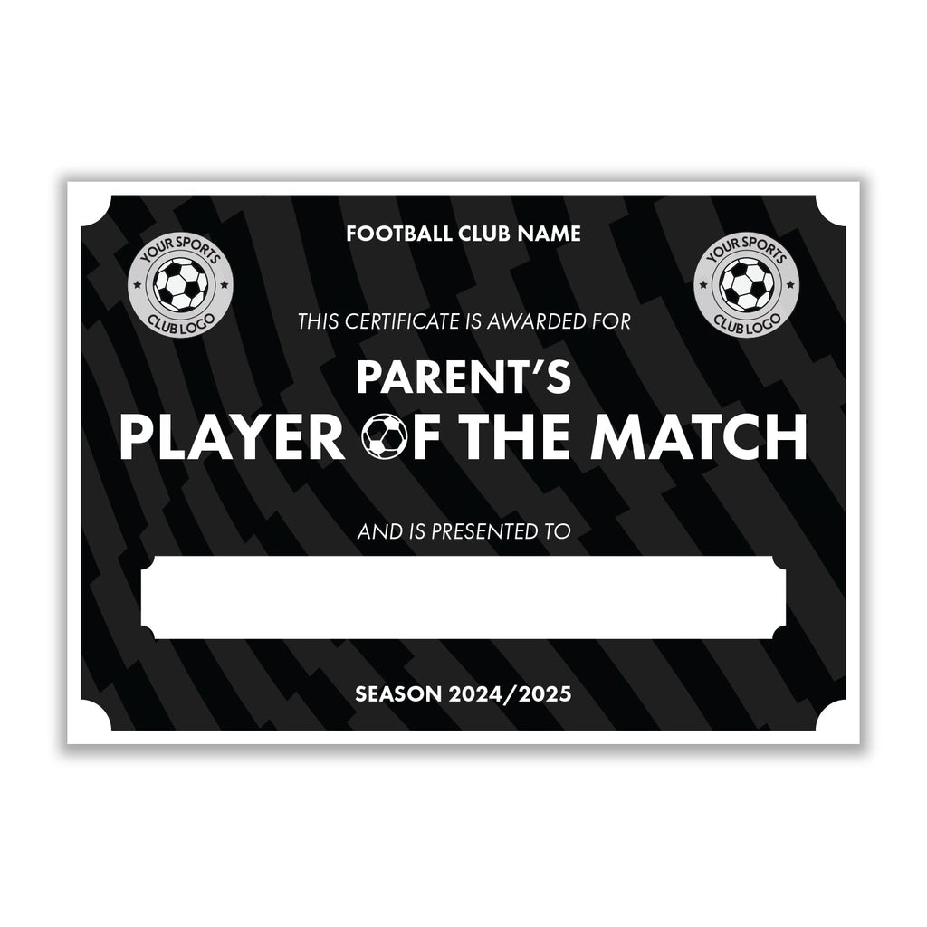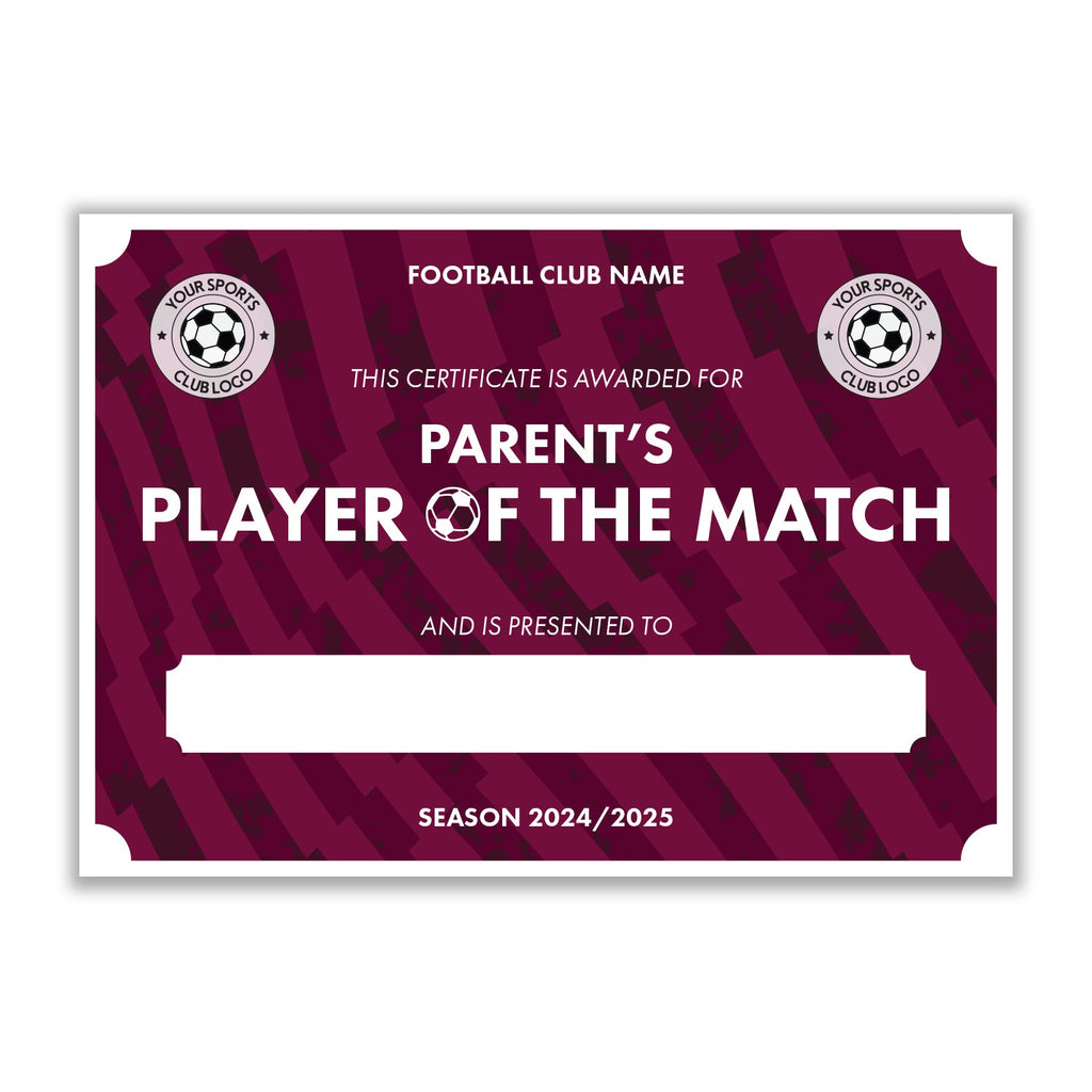 Personalised Football Club Certificates - Parent's Player Of The Match Custom Design (9 Colours)