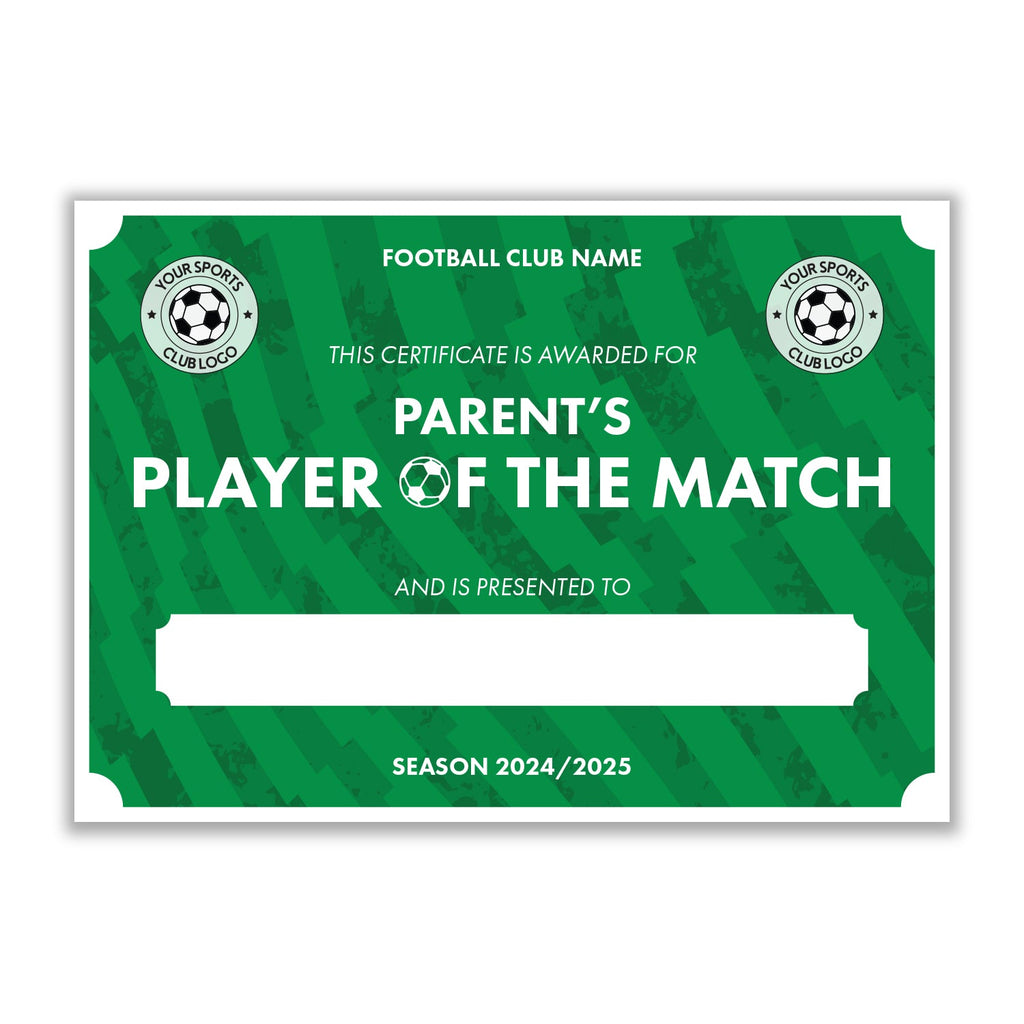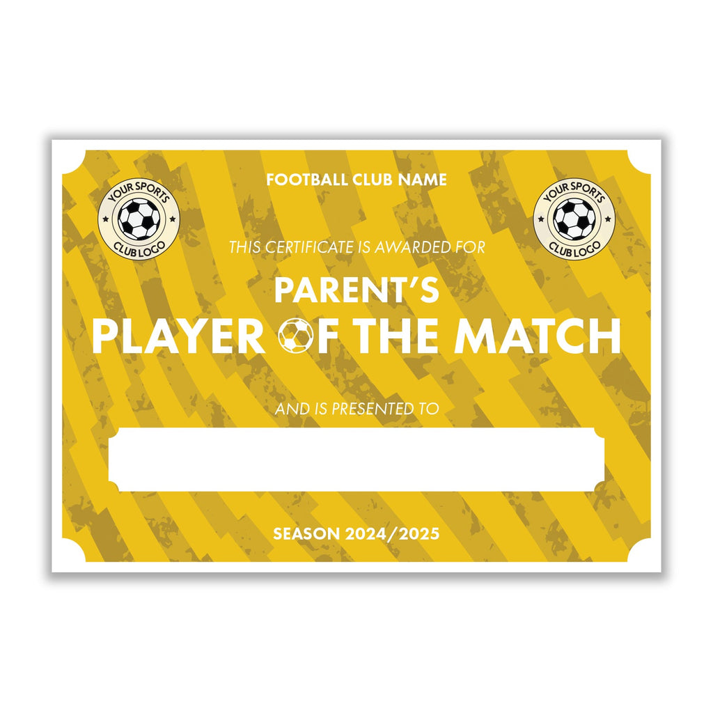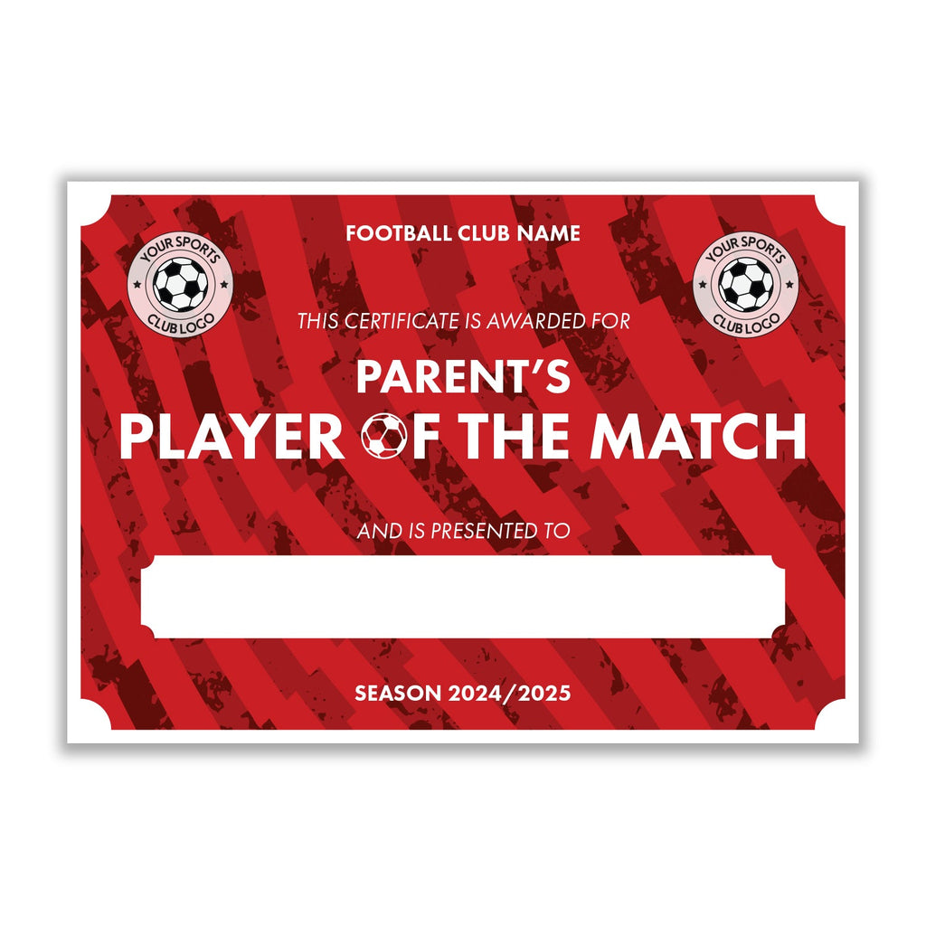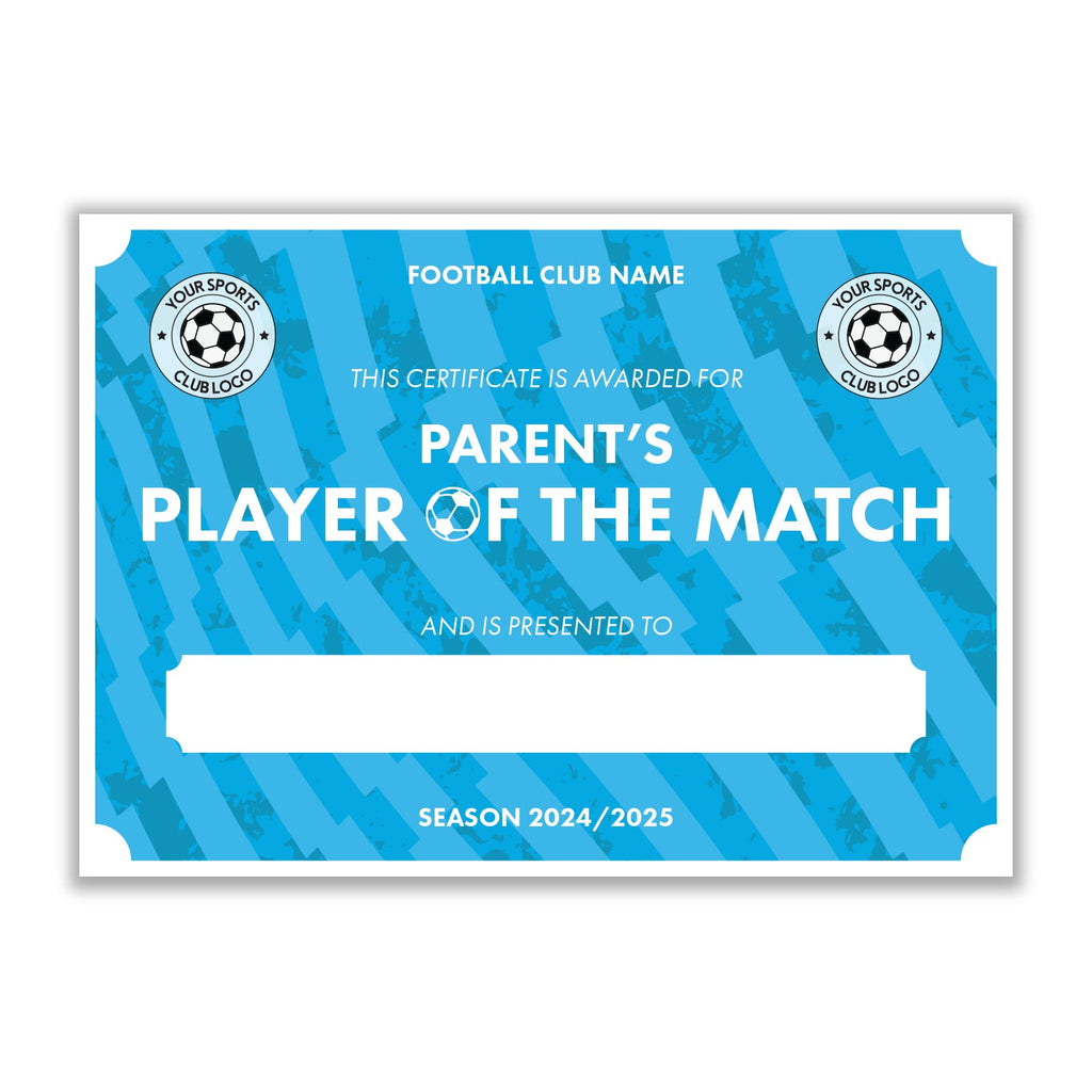 Personalised Football Club Certificates - Parent's Player Of The Match Custom Design (9 Colours)