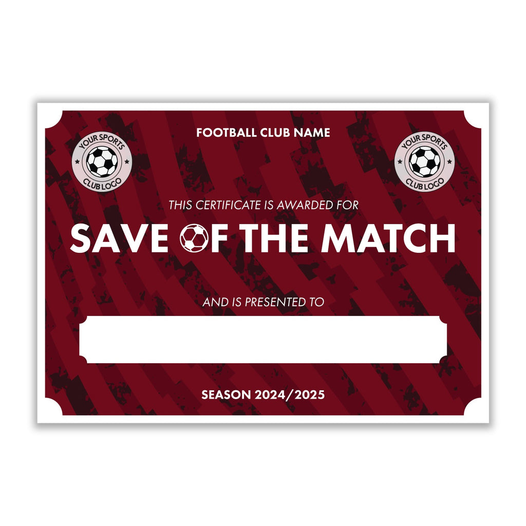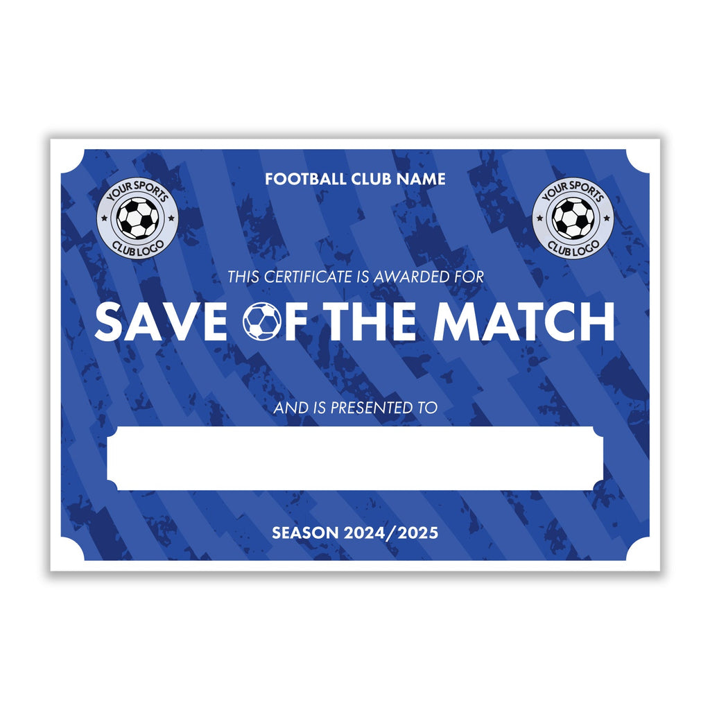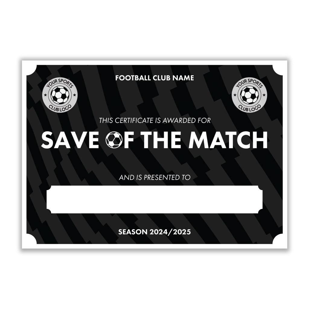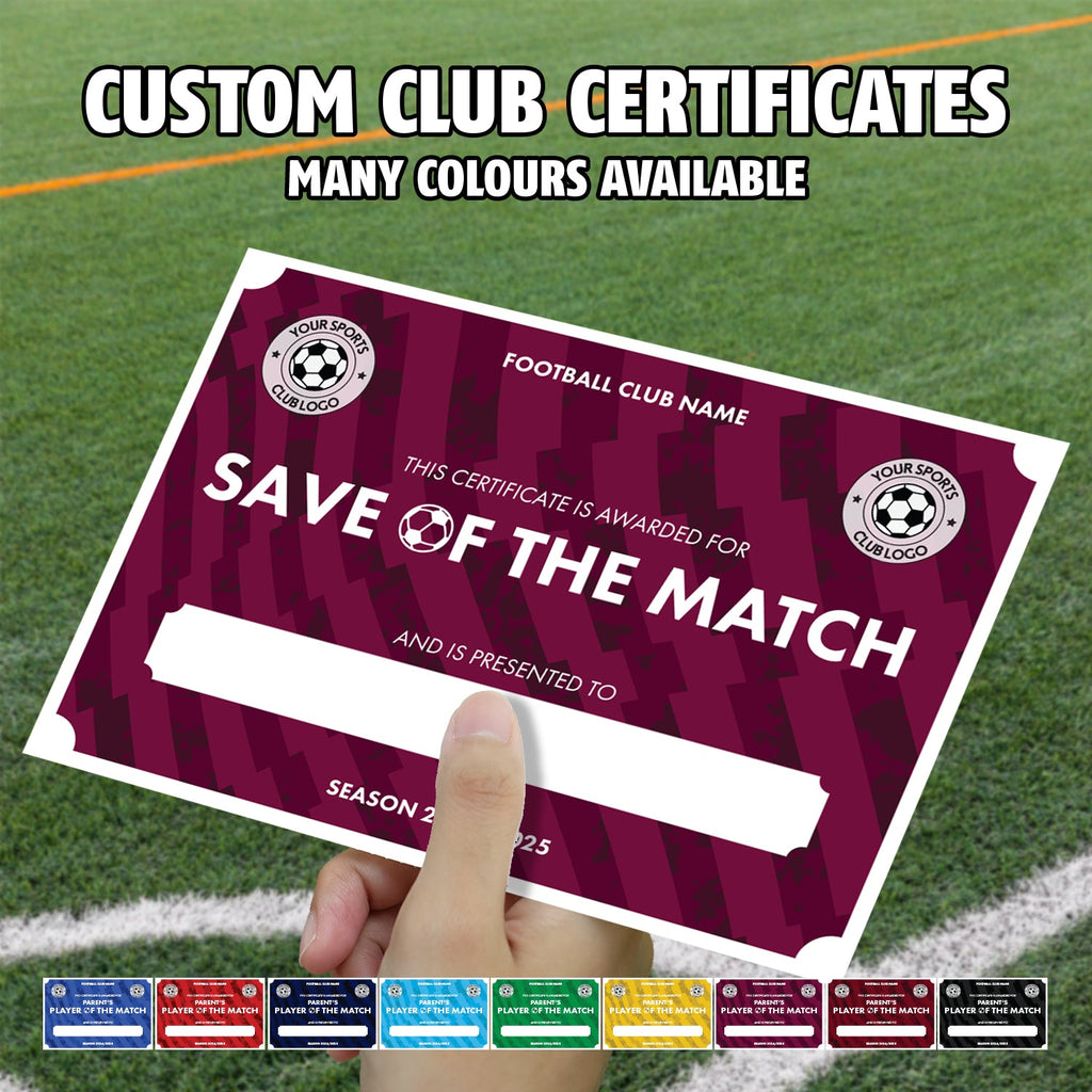 Personalised Football Club Certificates - Save Of The Match Custom Design (9 Colours)